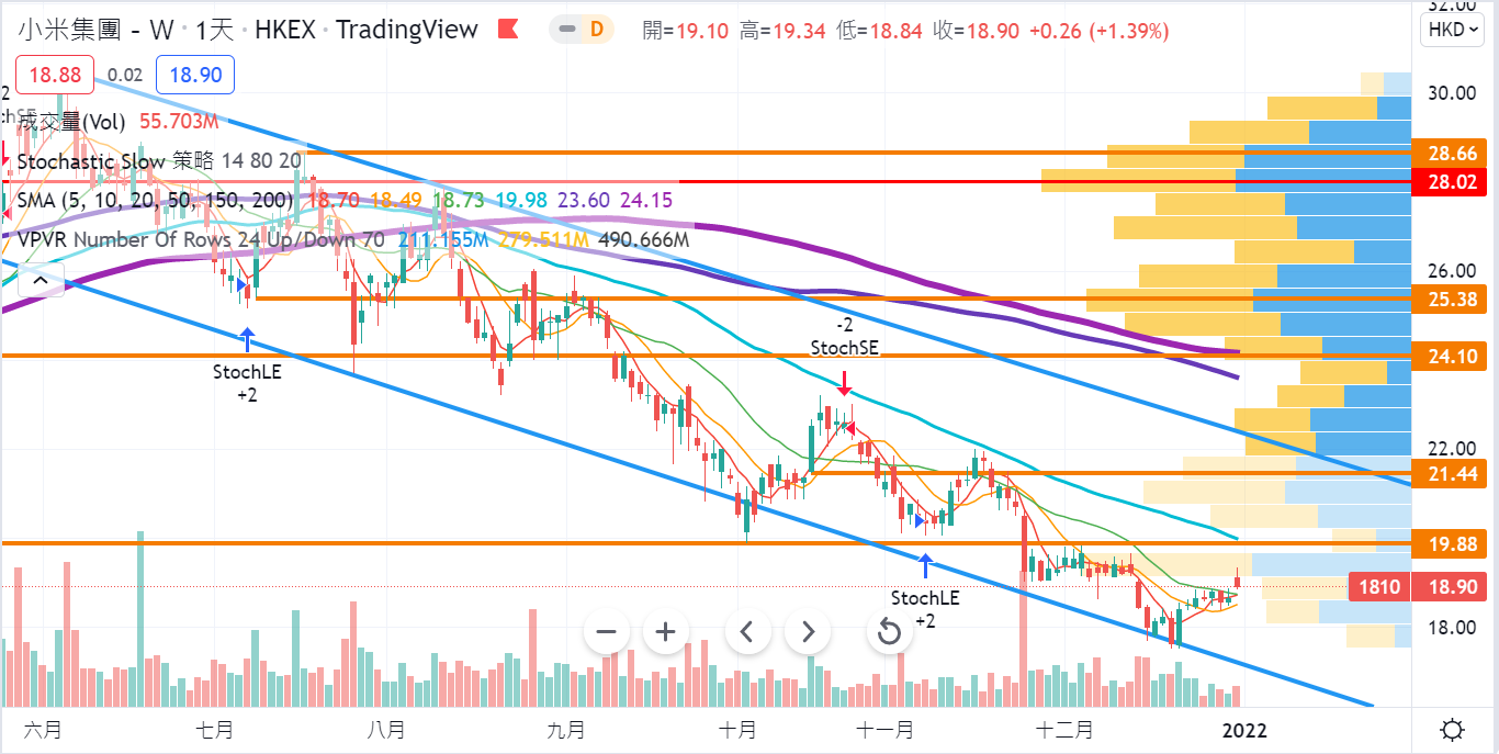 X-小米 01810 現價31.36(-1.40/-4.3%) -股價近日沿著5天及10天線反覆回升,逐步遠離下降通道底,回升至密集阻力位約19元至19.5元附近,#筆者持有正股好倉。