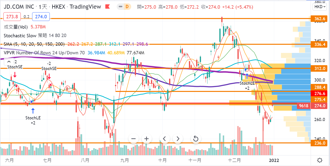 J-京東 09618 現價111.7(-0.200/-0.2%) -股價上周五突然裂口急彈,#可惜筆者此前於周初已短炒獲利離場,錯失了更佳的沽貨價位,目前股價在275元阻力線附近,且看看下周能否重返其上,短線以觀望為主。