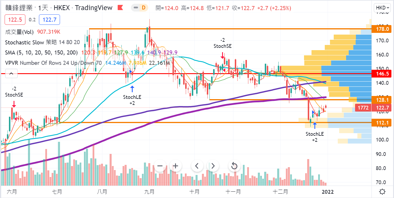 G-贛鋒 01772 現價77.45(+0.400/+0.5%) -股價上周略為回穩,反彈重上5天及10天兩條平均線,反映112元附近的支持線有承接力,然而,股價須重上128元附近的重要支持線方能確認擺脫劣勢,近期鋰電及電池產業負面消息較多,重注需留意風險,#筆者暫未見此股的基本面有變化,會繼續密切留意行業動向,目前仍然持貨。